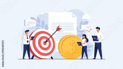 Podnikatel cíle úspěchy, finanční růst, ploché vektorové izometrické ilustrace. Podkova magnet cíl přitahuje zlaté mince.