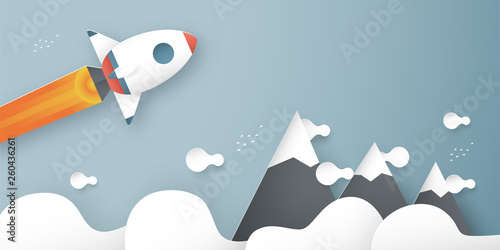 Podnikatel v lodi na vrcholu vlny oceánu, vektorové ilustrace v papírovém uměleckém stylu. Obchodní vůdce při pohledu přes dalekohled. Topí se ve vodních papírových člunech. Obchodní strategie, vize, úspěch.