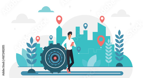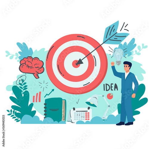Podnikatel vypouští raketu na velký cíl, plochá vektorová ilustrace. Spuštění obchodního projektu, cíle.