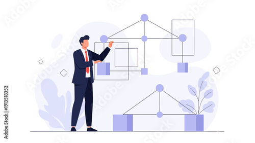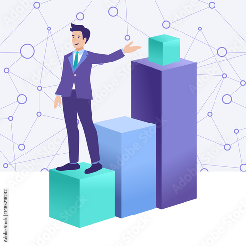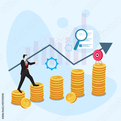 Obchodní muž při pohledu přes dalekohled stojící na mince stack, ploché vektorové ilustrace. Obchodní vůdce, kariérní růst, budoucí vize, finanční úspěch.