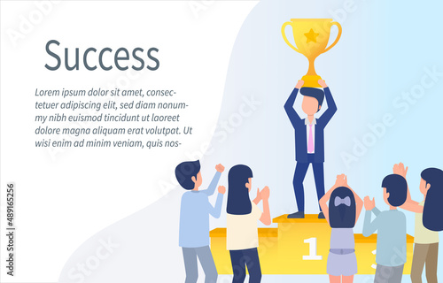 Podnikatel znaky tlačí domino dlaždice, drží trofej pohár, ploché vektorové izometrické ilustrace. Kancelářská válka, obchodní soutěž, koncept domino efektu.