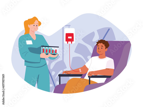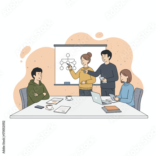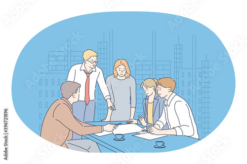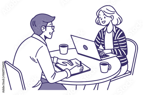 Podnikatel mluví se svým kolegou on-line pomocí počítače sedí u stolu v kanceláři, ploché vektorové ilustrace. Práce na dálku, domácí kancelář, komunikační technologie online chatu. Webinář, na volné noze.