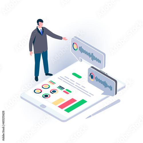 Podnikatel soustružení kvalitní metr šipka zpět s lanem z vysoké na nízkou úroveň, ploché vektorové izometrické ilustrace. Řízení cen. Strategie snižování nákladů.