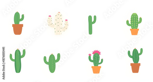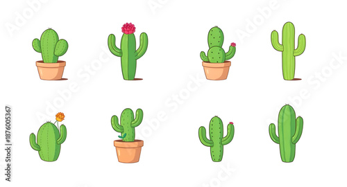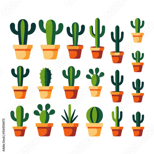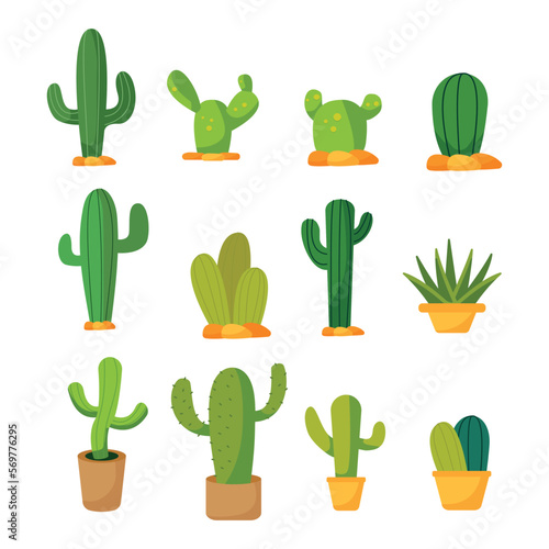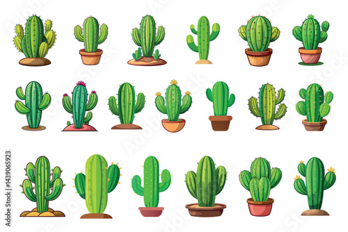 Kaktus pouštní květina rostoucí v květináči a zemi vektoru izolované sady. Mexické Kaktusy sukulentní rostlina na bílém pozadí. Pichlavý zahradní dekorativní pokojová rostlina ilustrace