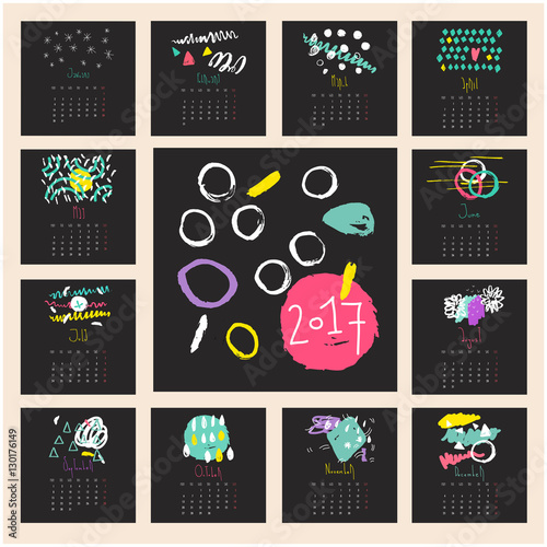 Rok 2019 kalendář vektorové šablony. Roční kalendář zobrazující měsíce s roztomilými vesmírnými zvířaty, raketami, planetami, souhvězdími.