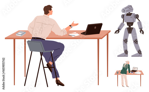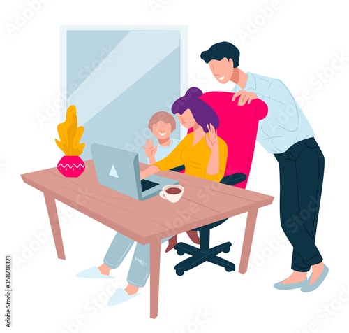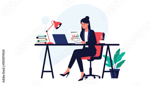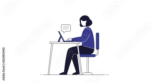 Žena s náhlavní soupravou pracující na notebooku, zatímco sedí u stolu. Vektorový plochý design ilustrace izolované na bílém pozadí. Koncept doručovací služby Call centra pro webový banner, webovou stránku atd.