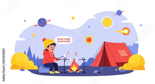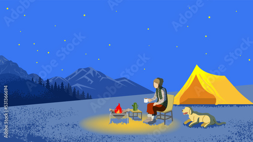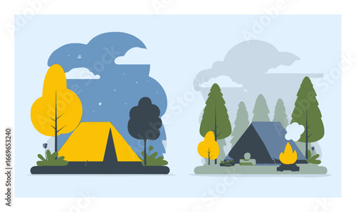 Kempování v lese vektorové webové bannerové šablony. Šťastný pár sedící u táboráku u stanu, plochá ilustrace. Letní kempování, turistika, dobrodružná turistika a cestování, kemp, venkovní aktivity.