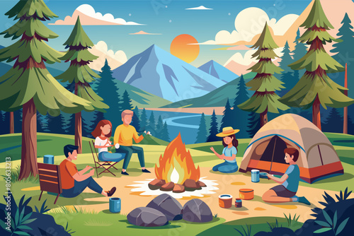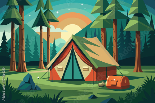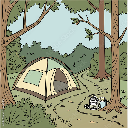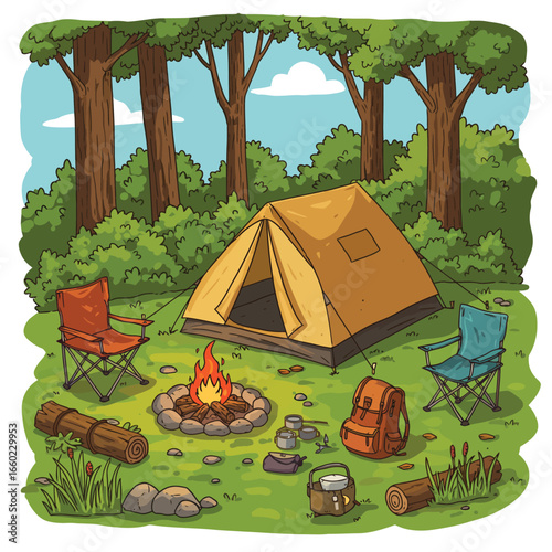 Kemp se stanem, táborák a karavan. Letní tábor dovolená vektorové ilustrace. Lesní krajina s kempinkovým vybavením. Dobrodružství, Příroda, táborák.