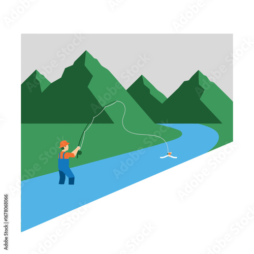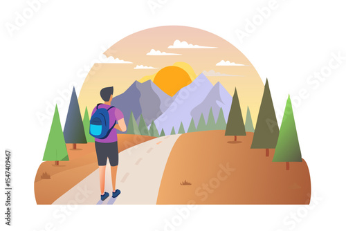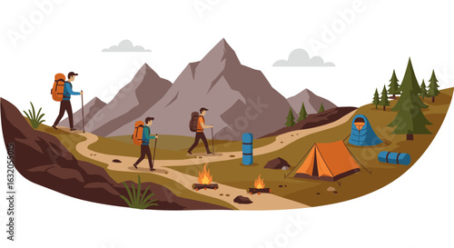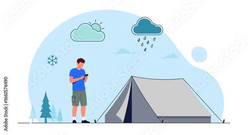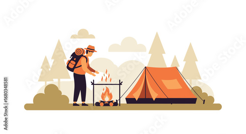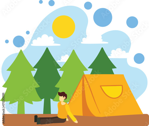 Camping vector. Šťastný pár užijte si víkend společně venku na přírodě. Muž a žena odpočívají ve stanovém táboře. Mladá žena vykukuje z nočního úkrytu, zatímco muž dělá ranní fyzické cvičení