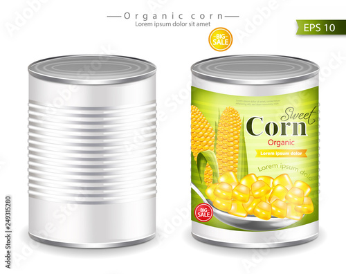 Konzervy kukuřice organický produkt balíček maketa set, vektorové ilustrace izolovaných na bílém pozadí. Realistické otevřené plechovky se štítkem a bez něj.