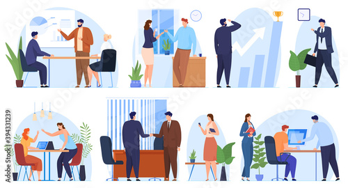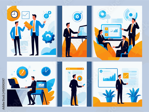 Autoservis a auto mechanik garáž. Sada kreslených vektorových plakátů. Muž opravit rozbité auto a vyměnit pneumatiky a olej. Auto tuning workshop. Mechanik mluví se zákazníkem.
