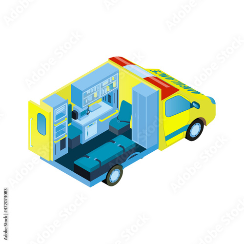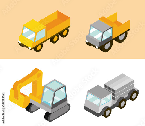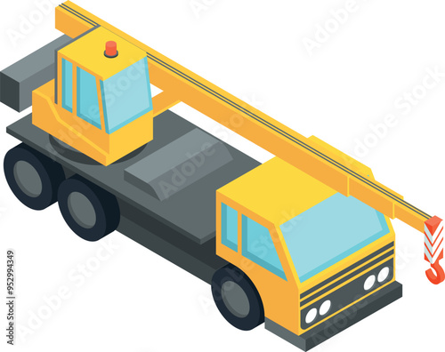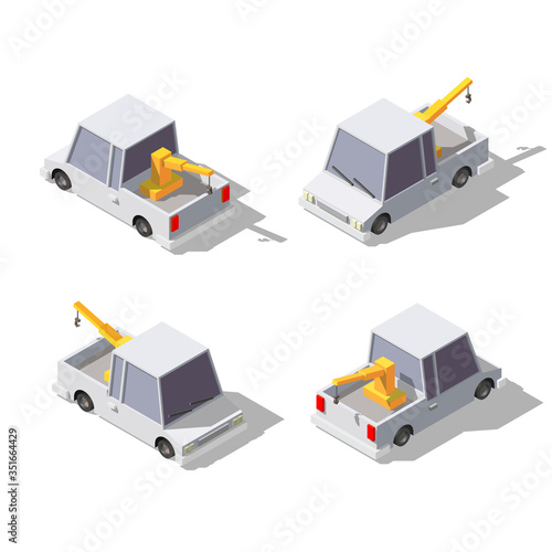 Auto dopravní nehoda a truck assistance emergency service vector icon. Izometrické Odtahovka evakuátor zvedání havaroval auto s jeřábem ilustrace izolovaných na bílém pozadí