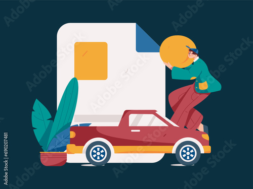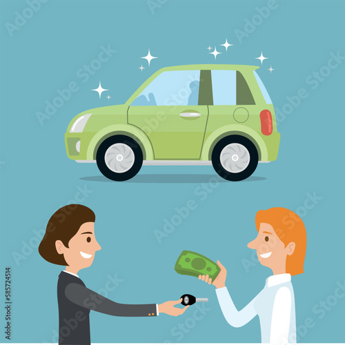 Prodej aut vektorové ilustrace. Zákazník kupuje auto od dealera concept. Prodavač dává klíč novému majiteli. Ruka drží peníze.