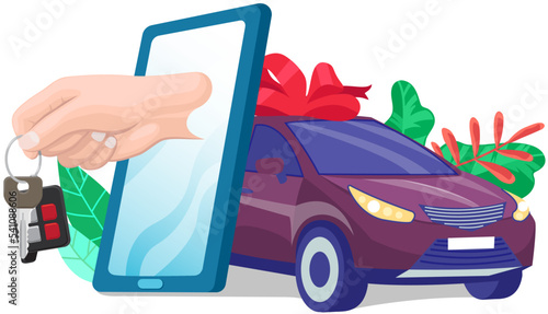 Prodej aut vektorové ilustrace. Zákazník kupuje auto od dealera concept. Prodavač dává klíč novému majiteli. Ruka drží peníze.