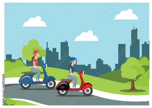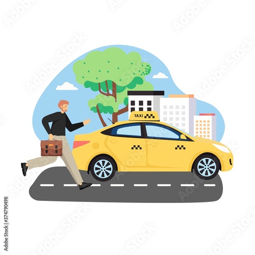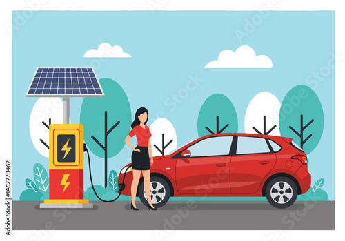 Mladá žena cestující autem, ploché vektorové ilustrace. Šťastná dívka s pasem a taškou stojící vedle červeného auta se zavazadly, kufrem a batohem na střeše. Výlet autem, silniční cestování, letní dovolená.