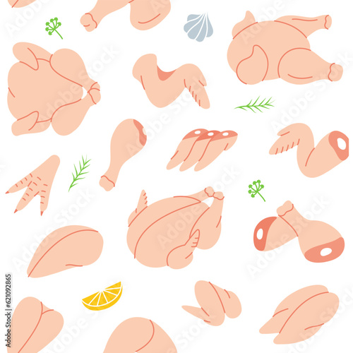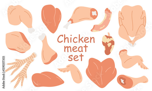 Kreslený kuřecí čerstvé syrové maso vektorové sady. Rozmanitost tepelně neupravených drůbežích biopotravin pro grilování ilustrace. Celá slepice, filet, křídla, klobásy, vejce, palička izolovaných na bílém pozadí