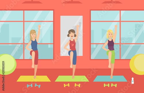 Kreslené děti ve škole sportovní tělocvična vektorové ilustrace. Sportovní aktivity volnočasové hry uvnitř. Školení učitelů s dětmi, chlapci a dívky dělají fyzická cvičení, kopání míče, skákání na laně