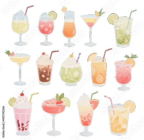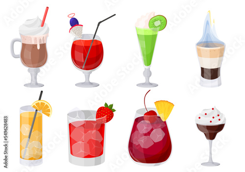 Kreslený tropické koktejly s ledem a šťávy vektoru. Alkoholový nápoj a nealkoholický nápoj izolovaný party set. Ikona čerstvého aperitivu pro restauraci koktejl-hall menu ilustrace