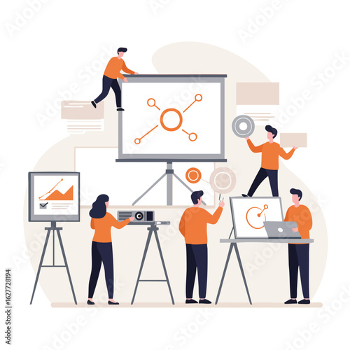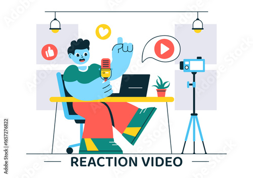 Casting vektor. Produkce filmu, režie filmu a studiové natáčení scénických prvků. Režisérská židle s hlasitým reproduktorem žena s klapačkou a kameramanská ilustrace