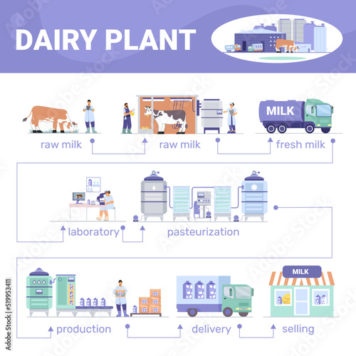 Chov skotu, výroba hovězího masa infographic, ploché vektorové ilustrace. Linka na zpracování masa. Distribuce, prodej, spotřeba. Potravinářství.