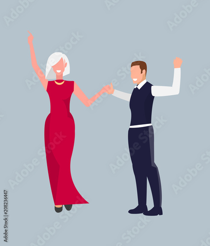 Šťastný pár tančí, vektorová plochá ilustrace izolovaná na bílém pozadí. Happy Birthday výročí firemní večírek nebo jiná událost oslava.
