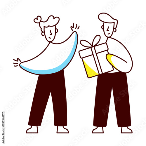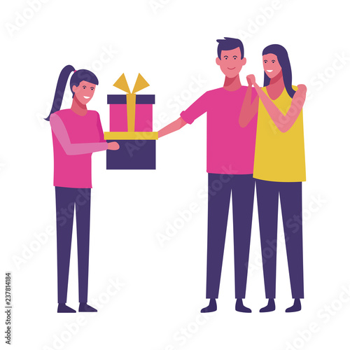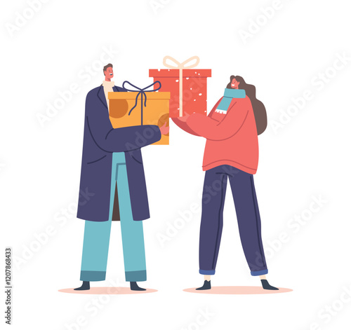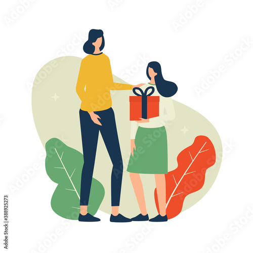 Mladý muž dává dárkovou krabičku šťastné a překvapené ženě, vektorová plochá ilustrace izolovaná na bílém pozadí. Happy birthday party nebo jiná událost oslava.