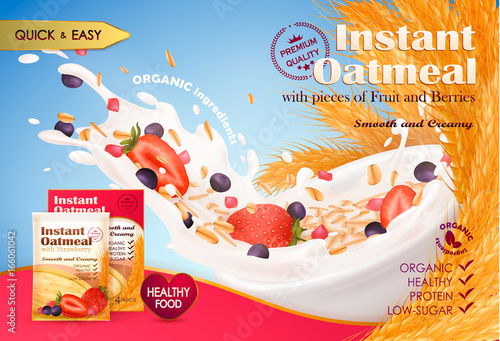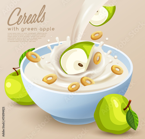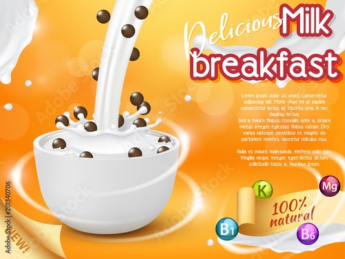 Cereální mísa se stříkajícím mlékem a padajícími čokoládovými cereálními kuličkami. Vektorové realistické ilustrace. Cereální snídaně obalová šablona designu nebo nový přírodní snídaně produkt reklamní plakát.