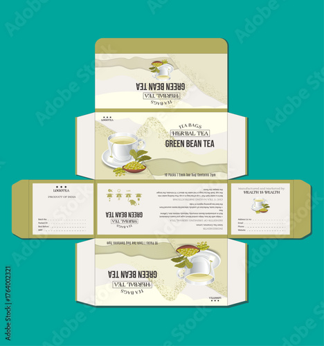 Heřmánkový čajový papírový box a sada maket na balení čajových sáčků. Vektorové realistické ilustrace.