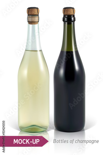 Láhev šampaňského vektor. Ikona balení šumivého vína. Realistický design makety alkoholického nápoje. Šablona balení nápojů na dovolenou nebo výročí