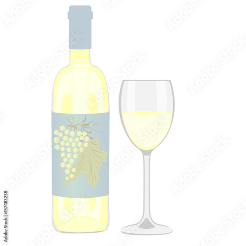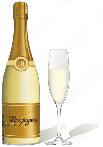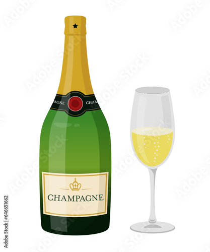 Šampaňské značky 3D vektorové maketa izolované. Láhev se štítkem a skleněným alkoholickým likérem na průhledném pozadí. Luxusní nápoj, alkoholický nápoj s logem