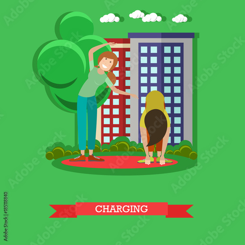 Vektorové ilustrace žen, které trénují v parku. Cvičení zvyšující energii nebo nabíjení tréninků koncept plochý styl designový prvek.