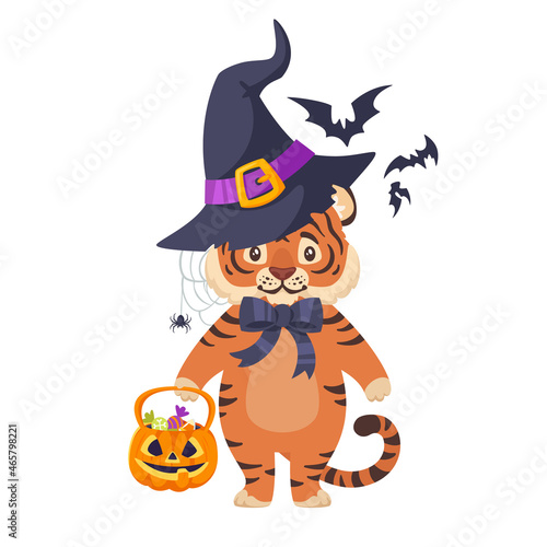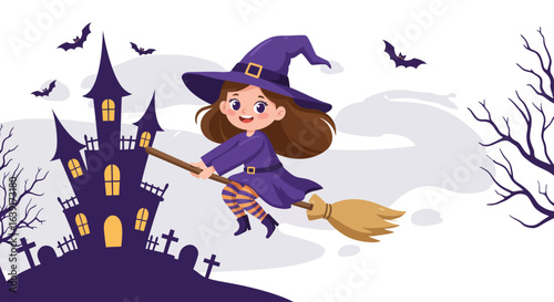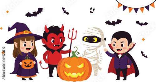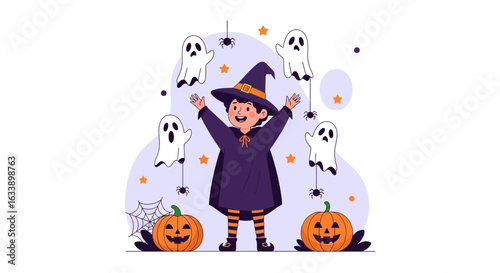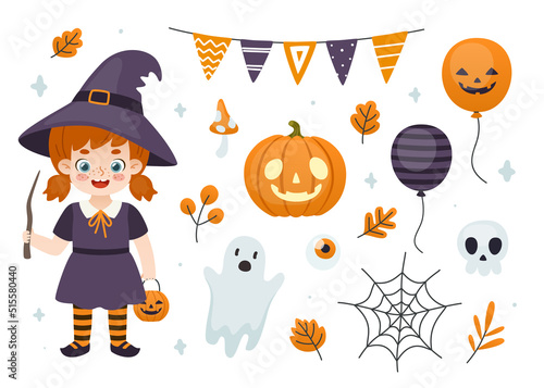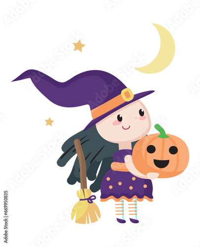 Čarodějky malá čarodějnice dívka dítě kreslený Halloween charakter vektorové ilustrace. Malá čarodějka drží vyřezávané dýně jack-O-lantern tradice podzimní symbol