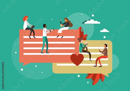 Chat zprávy bubliny a lidé chatování on-line, pití kávy, víno, ploché vektorové ilustrace. Řečová bublina, Komentáře. Dialog. Online Datum. Komunikační technologie chatu.
