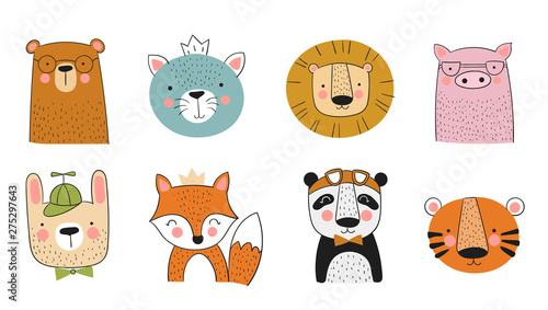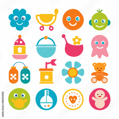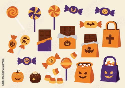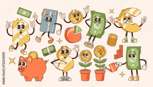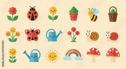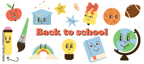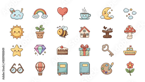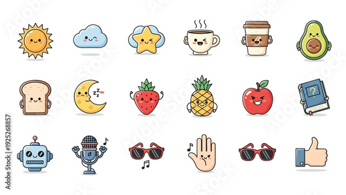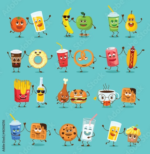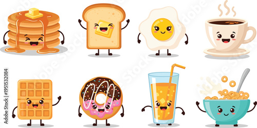 Veselá snídaně vektorová sada. Šťastný roztomilý Kawai mléčný balíček, sušenky a kaše, vejce se slaninou, chléb a džem, kobliha a palačinka, croissant citron a čaj ilustrace. Izolované roztomilé jídlo