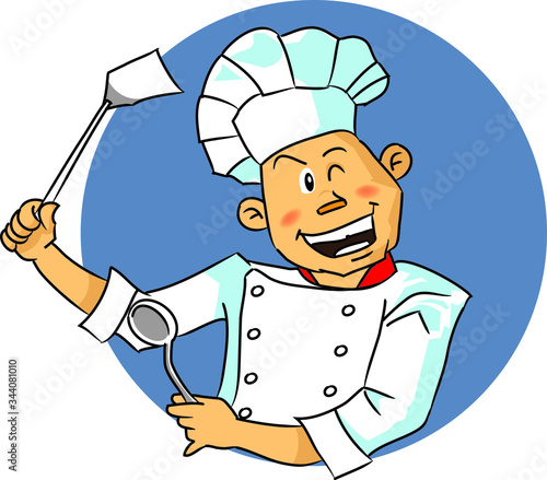 Šéfkuchař ukazuje OK znamení s prázdnou deskou za sebou. Vektorová ilustrace v retro komiksovém pop art stylu. Koncept restaurace.