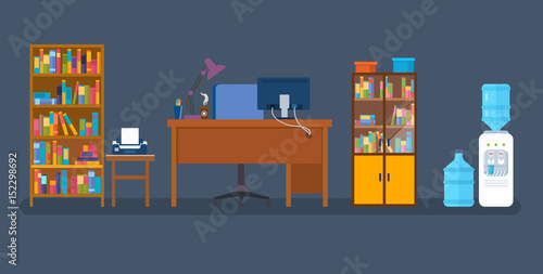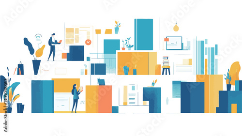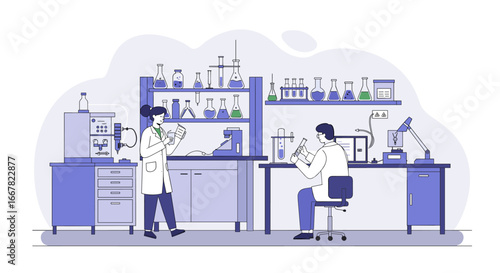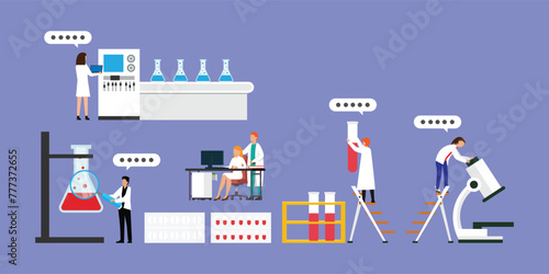 Vektorová ilustrace konceptu chemie v plochém stylu. Interiér laboratoře, chemici testující chemické prvky pomocí laboratorního vybavení a skla.