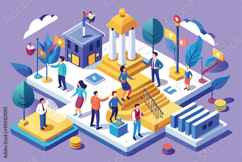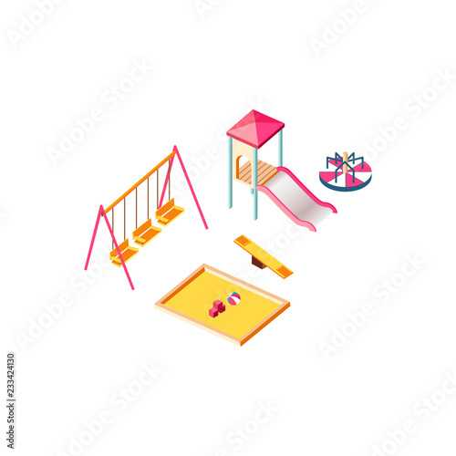 Dětské hřiště icon set, vektorové ploché izolované ilustrace. Izometrické skákací trampolíny, skluzavka, houpačka, jarní rocker, kolotoč, pískoviště atd. Hrací, sportovní a parkové vybavení pro venkovní použití.