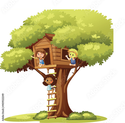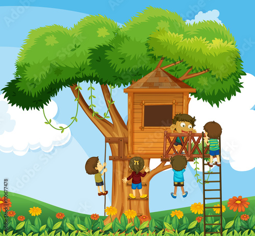 Děti si hrají v domě na stromě na zahradě zahradní vektorové ilustrace. Dva malý chlapec bratři nebo přátelé kreslená postavička blbnout baví během venku dobrodružství na letní dovolenou