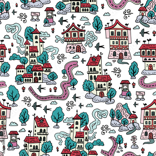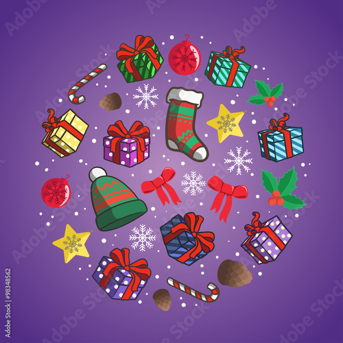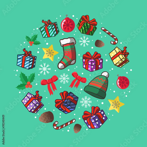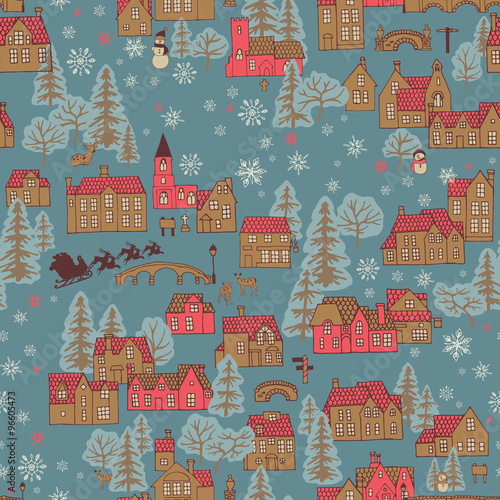 Vánoční a novoroční sezóna blahopřání a pozadí šablony. Zimní dovolená vektor ilustrace. 2021 Nový rok ručně kreslený plakát. Vánoční strom a hračky, lidé, městské budovy, sněhulák.