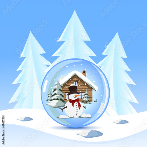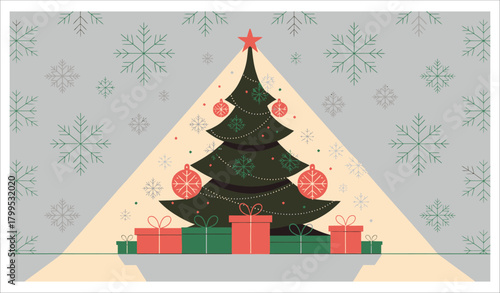 Vánoční strom cetka se zimní krajinou, zdobené stromy, koule, Lucerna, vektorové ilustrace v papírovém uměleckém stylu. Veselé vánoční přání design šablony.