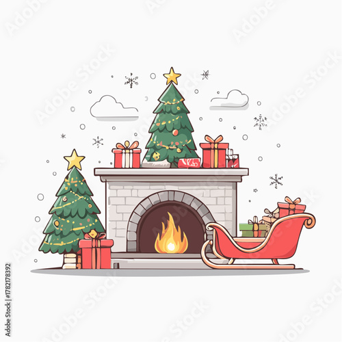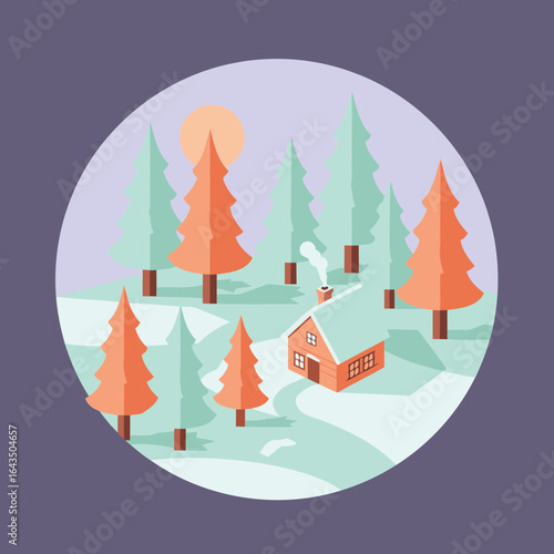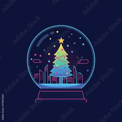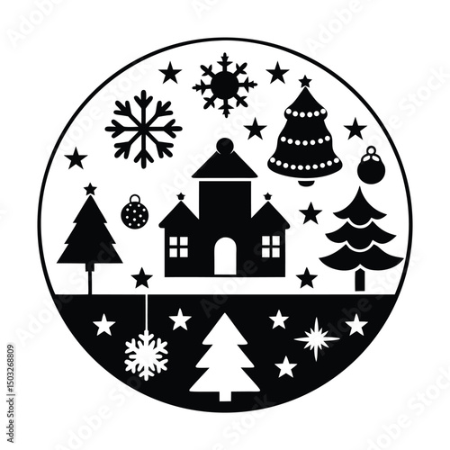 Vánoční strom cetka se zimní krajinou, zdobené stromy, koule, Lucerna, vektorové ilustrace v papírovém uměleckém stylu. Veselé vánoční přání design šablony.