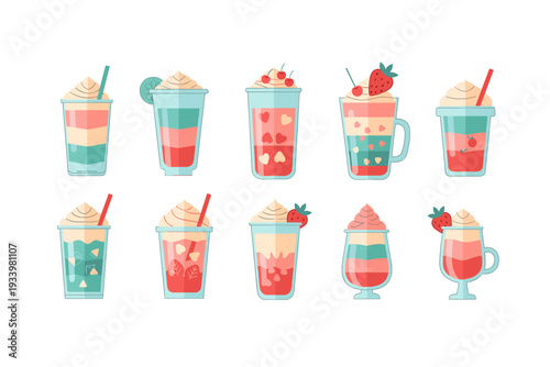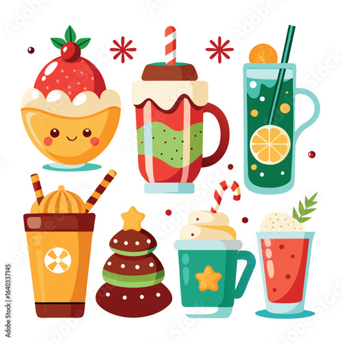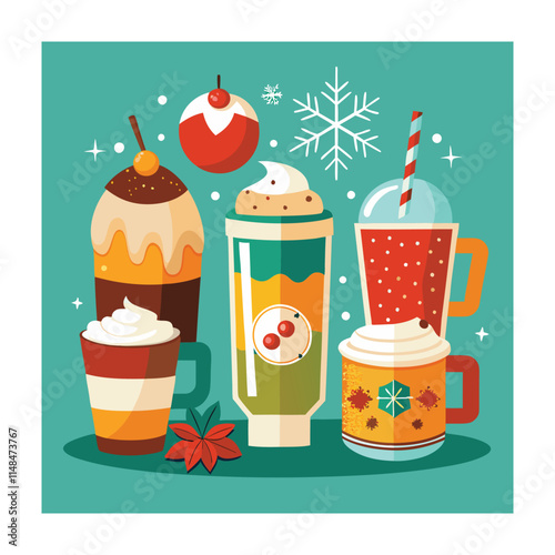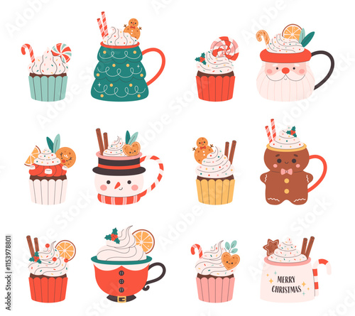 Vánoční dovolená hrnek na kávu s teplými nápoji vector set. Kakao s marshmallows, zimní oteplování nápoj jako espresso, horká čokoláda, cappuccino, latte a svařené víno izolované ilustrace