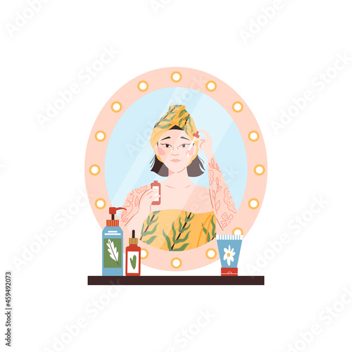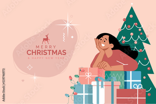 Vánoční dovolená domů dekorace vektor koncept ilustrace. Šťastná žena zdobí vánoční stromek. Šablona návrhu webových stránek. Krb.