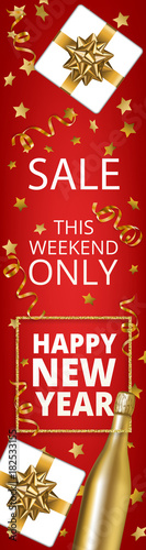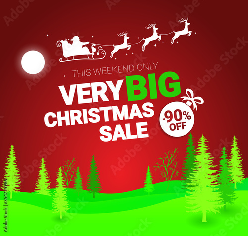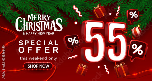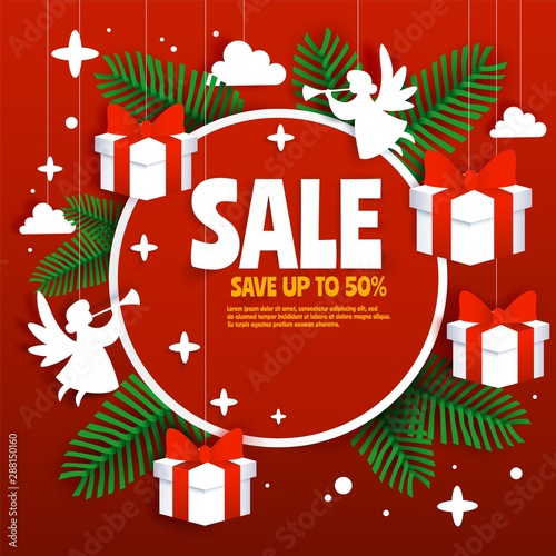 Vánoční výprodej plakát šablona, vektorové ilustrace v papírové umění moderní řemeslné stylu. 50% sleva propagace červený banner webových stránek s větvemi vánočních stromků, anděly, dárkovými krabičkami.
