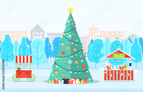 Vánoční strom a dárková krabička se stuhou a lukem na pódiu, vektorové ilustrace v papírovém uměleckém stylu. Veselé Vánoce a Nový rok Prodej dárků, dekorací. Vánoční dárky.