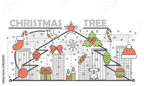 Vector Nový Rok blahopřání design s dovolenou ozdobné symboly vánoční strom, santa claus klobouk, dárková krabička, bonbóny, holly bobule, Nový rok nápisy. Tenká čára plochý styl designu ilustrace.