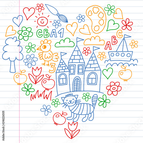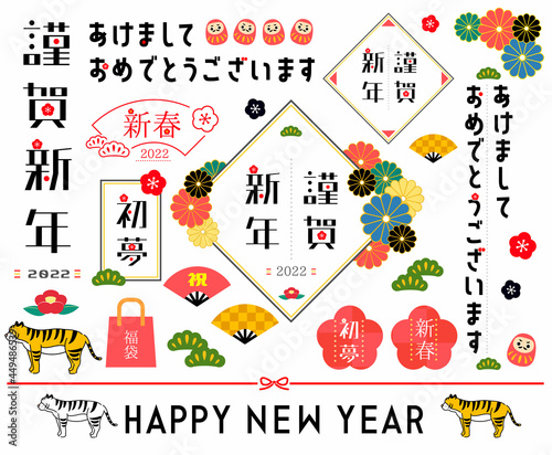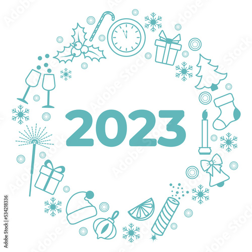 Vector Nový Rok blahopřání design s dovolenou ozdobné symboly vánoční strom, santa claus klobouk, dárková krabička, bonbóny, vánoční koule, holly bobule. Tenká čára plochý styl designu ilustrace.