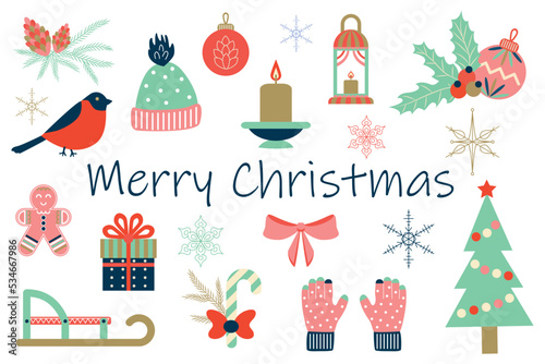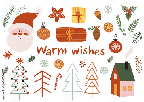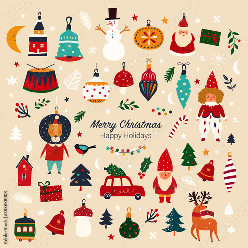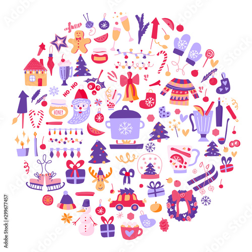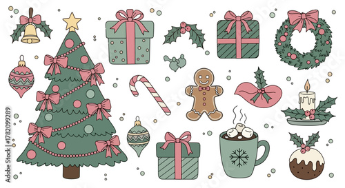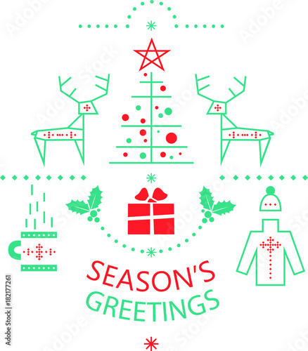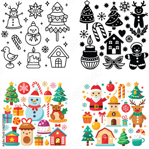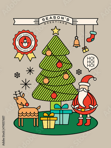 Vánoční strom s vánočními a novoročními ikonami. Vektorové dekorativní sváteční symboly sobů, dárek, sněhulák, zvony, šampaňské. Tenká čára plochý styl design ilustrace izolované na bílém pozadí.
