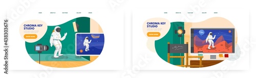 Chroma key studio, Design vstupní stránky, sada šablon webových stránek, ilustrace plochého vektoru. Herec astronaut v hlavní roli ve vesmírném filmu. Technologie zelené obrazovky. Filmová produkce.
