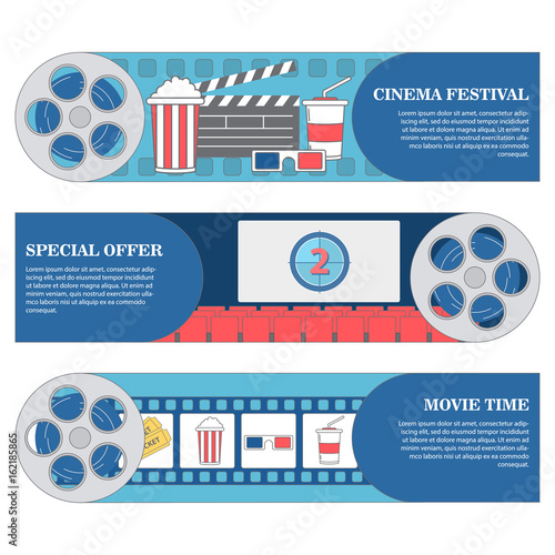 Kino festival horizontální bannery. Vektorová sada bannerů filmového kina. šablona návrhu plakátu v plochém stylu.